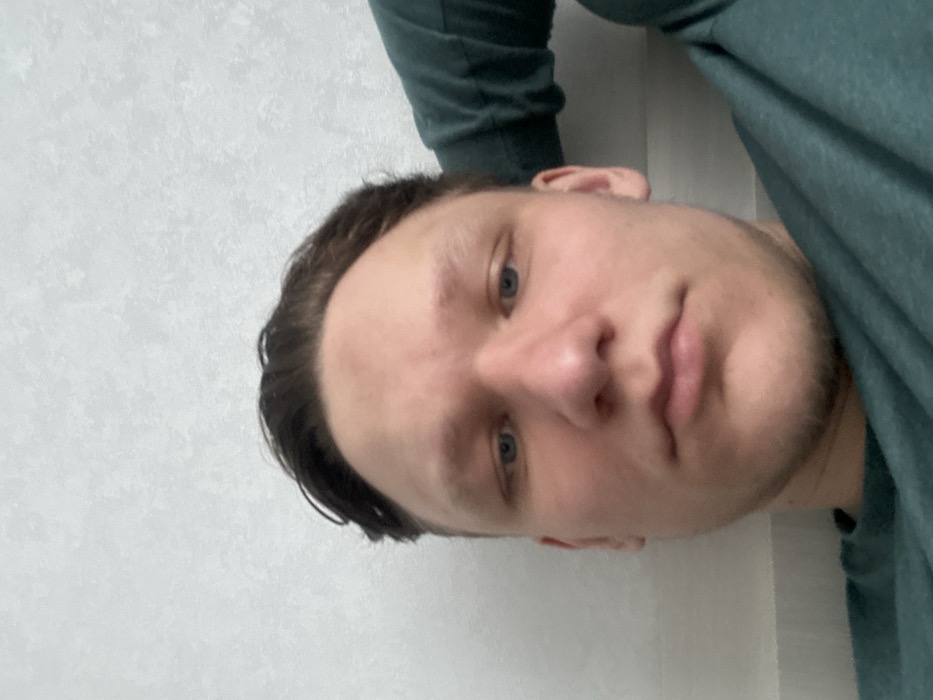 A close-up, front-facing selfie depicts a young adult male in an indoor setting
