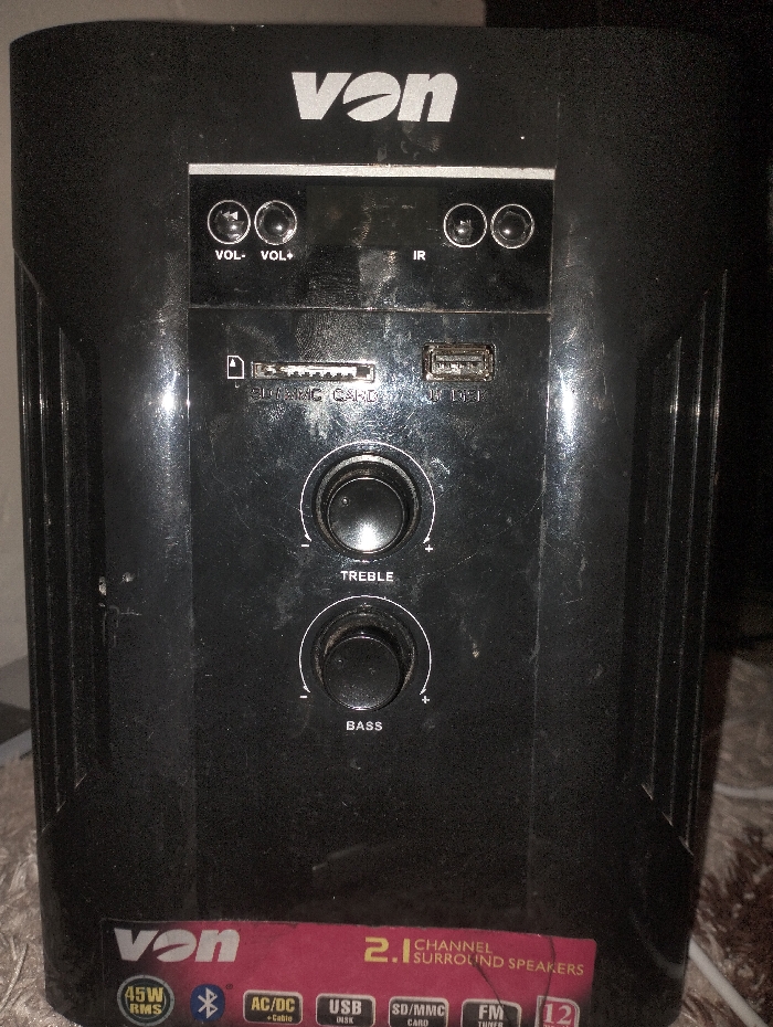 A black "von" brand 2.1 channel surround speaker unit is centered in a static, close-up, front-facing photograph. The speaker's dark plastic casing exhibits visible dust, multiple scuffs, and minor scratches, particularly on the control panel and side edges; a prominent smudge mark is visible below the upper "von" logo near the infrared receiver. The speaker's front panel features a vertical arrangement of controls and ports. Below the upper "von" logo, two circular buttons are labeled "VOL-" and "VOL+". To their right, an "IR" (infrared) receiver window is flanked by two small circular depressions. Beneath this section, a horizontal slot is present for "SD/MMC CARD" insertion, with a standard "USB" port immediately adjacent to its right. Further down, two black rotary knobs with white indicators control audio equalization; the upper knob is labeled "TREBLE" and the lower "BASS," each featuring positive and negative adjustment markings. A red rectangular label is affixed to the bottom of the speaker, displaying the "von" logo and identifying it as "2.1 CHANNEL SURROUND SPEAKERS." Additional specifications and features listed on this label include "45W RMS," a Bluetooth symbol, "AC/DC +Cable," "USB Disk," "SD/MMC CARD," "FM TUNER," and "12 Months." The speaker rests on a textured, patterned surface, possibly a rug or carpet, partially visible at the bottom of the frame. The background behind the speaker is dark and undifferentiated. No individuals or active interactions are depicted. The location is Unknown, Unknown.