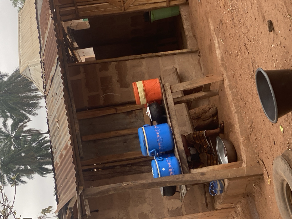 A low-angle shot displays a dilapidated structure with a corrugated iron roof. Inside, storage containers in various colors and sizes are stacked on wooden shelves. A person lies seemingly asleep amidst the containers and a metal bowl. Outside, bare reddish-brown earth is visible, along with a black bucket and a tire. A palm tree is visible on the left. The scene conveys a sense of poverty and simple living.