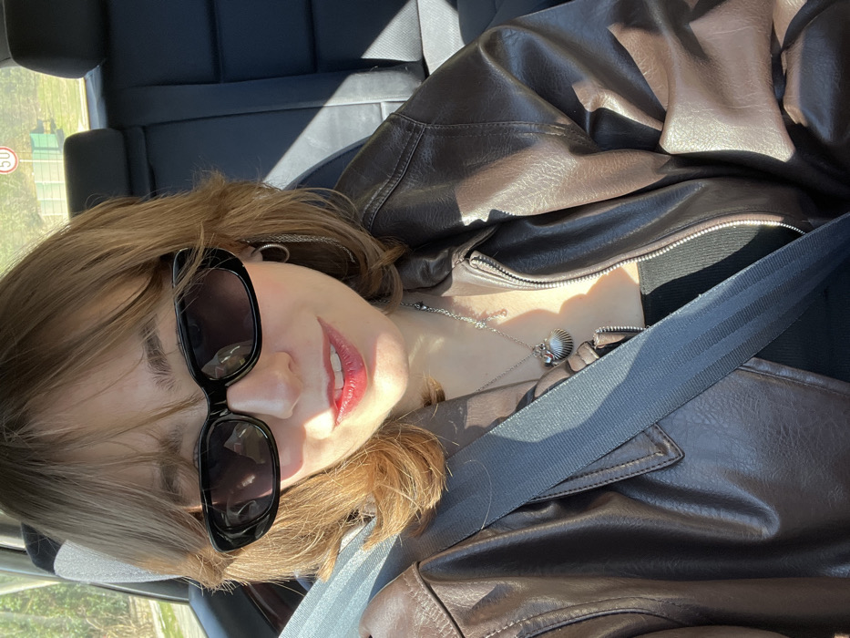 A female individual is seated in the rear passenger seat of a vehicle, buckled with a dark grey seatbelt, and is presumed to be in Đenovići, Montenegro. She wears black rectangular sunglasses, has shoulder-length light brown hair with bangs, and red-tinted lips. Her attire consists of a dark brown leather jacket over a black garment. Visible accessories include silver hoop earrings and a silver necklace featuring a seashell pendant and a smaller clear pendant. Sunlight illuminates the right side of her face and body, casting distinct shadows. The vehicle's interior features black headrests and upholstery. Through the rear window, an exterior environment is visible, comprising green foliage, a light-colored structure, and a circular white road sign with a red border and the number '50' in black, indicating a speed limit. Green netting is present behind the road sign.