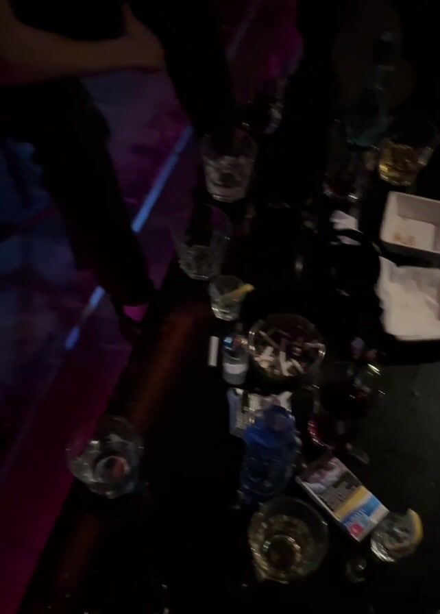table covered with glasses, cigarettes, and trash, probably left behind by patrons at a nightclub. The camera pans up to show a crowded club, with people mingling and talking amidst the flashing lights. A man briefly glances at the camera.