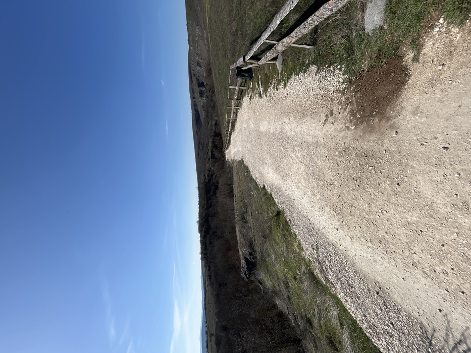 The image presents a natural landscape in the vicinity of Lukovit, Bulgaria, under a clear, bright blue sky with negligible cloud cover. A light-colored gravel path, approximately three meters wide, originates in the foreground and curves gently to the left as it recedes into the middle ground. On the right side of the path, a rustic fence composed of horizontal wooden rails supported by vertical wooden posts runs parallel to the path. Behind this fence, sparse green and dry grass covers the ground. A black trash receptacle is positioned immediately behind the fence. Directly adjacent to the path on its right edge, a patch of dark, disturbed earth is visible. To the left of the path, the terrain slopes downwards, characterized by sparse green vegetation, dry grass, and exposed gray rock formations. Beyond this immediate slope, a dense area of bare deciduous trees and shrubs fills a lower area, indicating a winter or early spring season. In the mid-distance on the right, prominent gray rock cliffs or bluffs are visible amidst the hilly topography. The background consists of rolling hills covered in similar bare vegetation. No individuals, animals, or artificial structures other than the path, fence, and trash receptacle are present. The scene is illuminated by direct sunlight, casting even light across the landscape.
