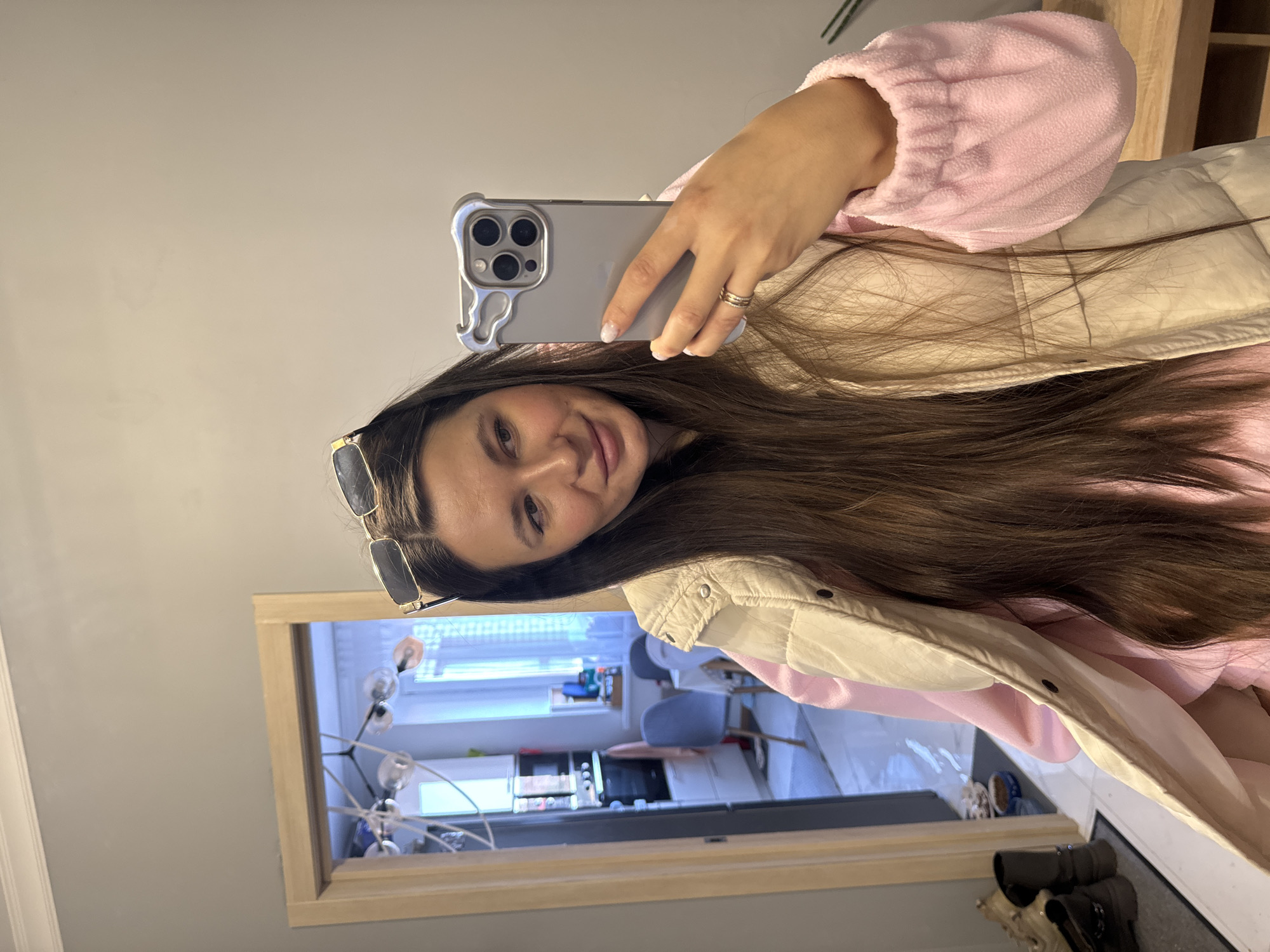 A female subject is depicted taking a mirror selfie inside a residence in Vnukovo, Russia. She has long, dark brown hair and is wearing sunglasses on top of her head. She is dressed in a light pink long-sleeved top and a cream-colored quilted vest. Her right hand, adorned with multiple rings, holds a silver smartphone encased in a silver, textured protective case that features a triple-lens camera configuration. The subject is looking towards the phone with a slight smile. The background reveals a light grey wall and a doorway with a light wooden frame. Through the doorway, an adjacent room is visible, featuring a modern chandelier with exposed bulbs, a white dining table with two light blue chairs, kitchen appliances, and a window with white blinds. Near the doorway, on the floor, several pairs of shoes and a dark pet food bowl are present. A light-colored wooden surface is partially visible on the right side of the image.