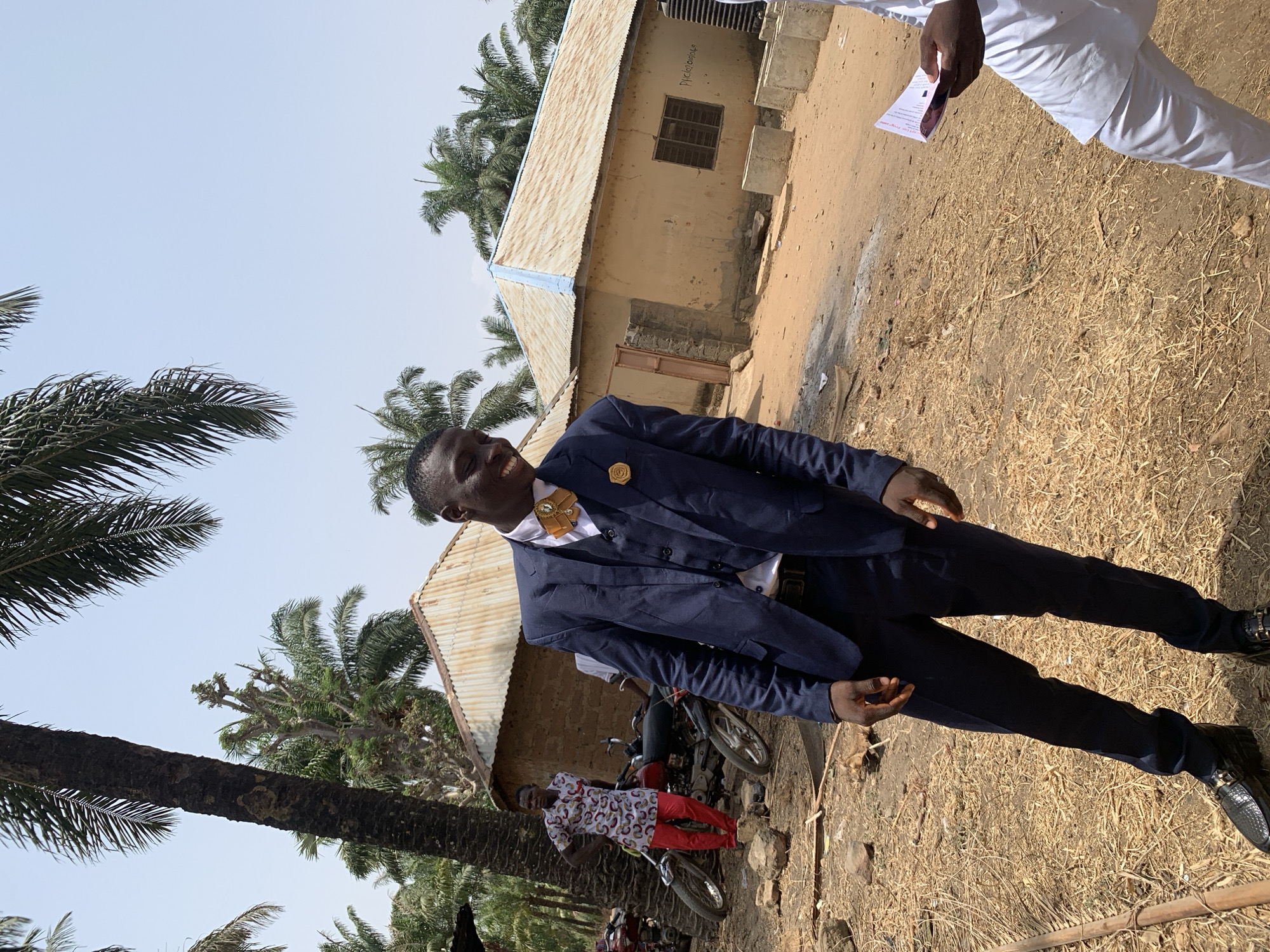 The scene depicts an outdoor gathering in the city of Washo, Nigeria, under bright daylight with a clear blue sky. The ground consists of dry, reddish-brown dirt interspersed with sparse dried vegetation and small rocks. Numerous tall palm trees with green fronds are visible, framing the upper and left portions of the image, alongside a prominent large tree trunk on the left. In the foreground, slightly right of center, a young Black male is the primary subject. He is dressed in a dark blue three-piece suit, a white collared shirt, and dark, patterned platform loafers with gold-colored buckles. A distinctive gold-colored neck accessory, possibly an elaborate bow tie or brooch, is affixed to his shirt, accompanied by a golden rose lapel pin on his jacket. He is smiling broadly, looking towards his left. To the left, in the mid-ground, a second Black male stands near two parked motorcycles. He wears a short-sleeved, brightly patterned shirt (featuring red, white, and blueish/black designs) and red trousers, with his hands clasped behind his back. The motorcycles are primarily red and black. On the far right in the foreground, only the lower torso and arm of a third individual are visible. This person wears white traditional attire and holds a small, open booklet or piece of paper in their right hand. In the background, two single-story structures with corrugated metal roofs are visible. The building on the left features a rusty-brown roof, while the building on the right has a similar roof with a patch of light blue paint along the ridge. Both buildings appear to be constructed from light-colored mud or stucco. The building on the right has a rectangular window with metal bars and what appears to be handwritten text or graffiti ("P.I.C.L.O.I.O.I.S.O") on its wall. Next to this building, a black water tank is partially visible, along with several concrete rings resting on the ground.