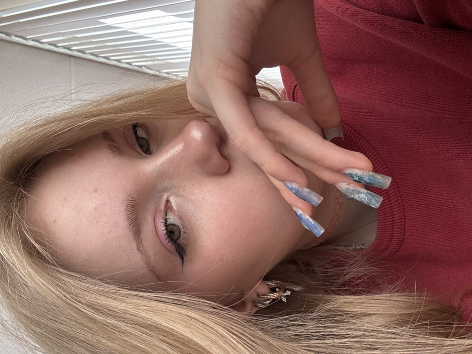 - "A blonde woman with olive eyes gazes upwards, her hand posed near her face showing off her long, cloudy sky-themed nails" by FM-qcn5l1, licensed under CC BY 4.0