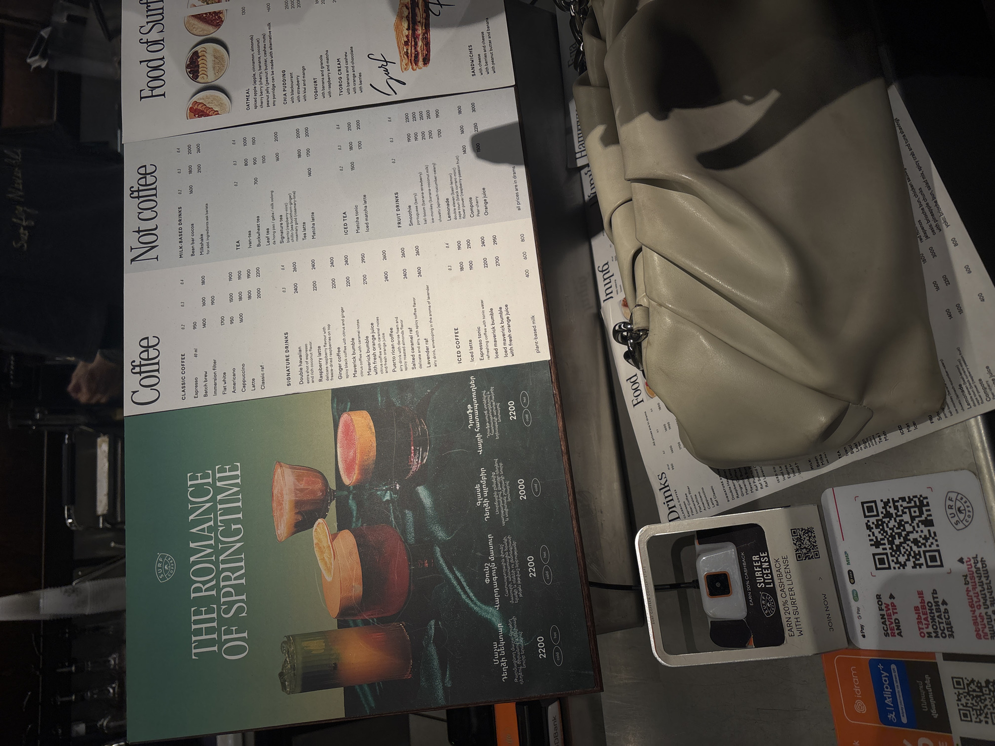 The image captures a tabletop setting in a cafe or restaurant in Yerevan, Armenia. The dominant feature is a menu from "Surf Coffee," titled "The Romance of Springtime" and displaying a range of coffee, drink, and food options in both English and Armenian. The menu is partially obscured by a light-colored bag, likely a handbag or purse. In the foreground, there is a digital payment terminal and a card reader with a QR code for customer reviews and tips, along with other payment service advertisements. The environment indicates an establishment in Yerevan.