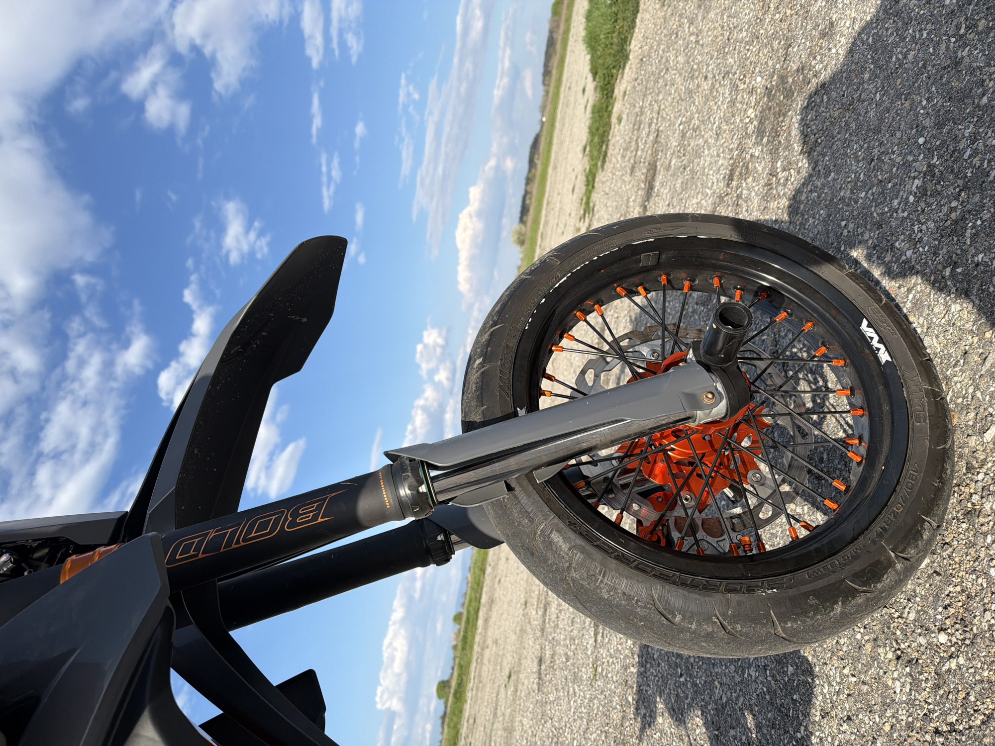 The image depicts the front wheel and suspension of a black and orange motorcycle on a concrete surface, possibly a road or parking area. The sky is visible in the background, exhibiting scattered clouds and blue patches. The foreground shows details of the motorcycle's front suspension, including the "BOLD" branded fork tubes. The front wheel has orange spoke nipples and a "VMAX" branded tire. The surrounding environment appears to be a rural or semi-rural area, with a grassy or agricultural field visible on the horizon. There is no indication of Voysil, Bulgaria or any human presence.