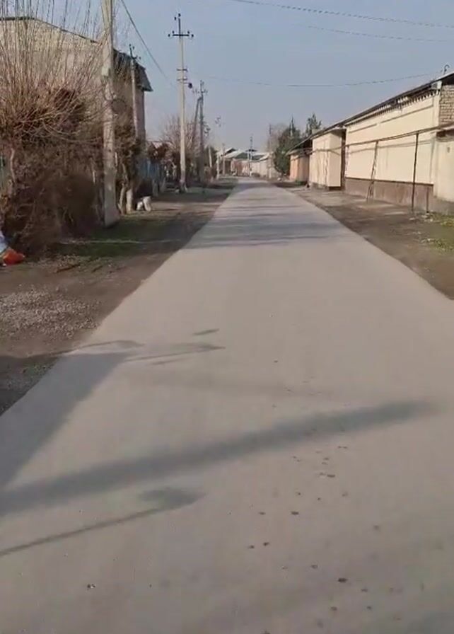 straight, paved road in a rural or suburban environment. On either side of the road are buildings, some of which appear to be houses or sheds, and bare trees without leaves. Utility poles with power lines run along the side of the road, casting shadows on the pavement. The sky is visible at the end of the road and is mostly clear. The light suggests it is daytime. There is no traffic or pedestrian movement. The video is taken from a perspective that seems to be moving forward along the road, possibly filmed while walking or from a slow-moving vehicle. The overall scene is quiet and still.