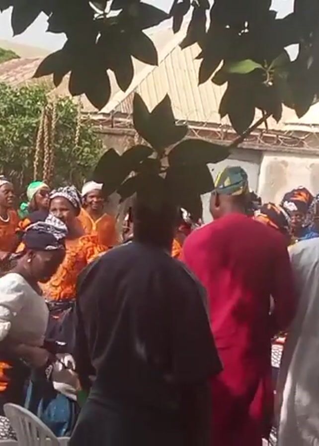 group of people celebrating outdoors. Many of the women are wearing orange and black traditional dresses and headwraps, while some men wear colorful caps. The group is standing in a circle, dancing and singing, with some using instruments. The surrounding environment includes a building with a corrugated metal roof, trees, and a fence.