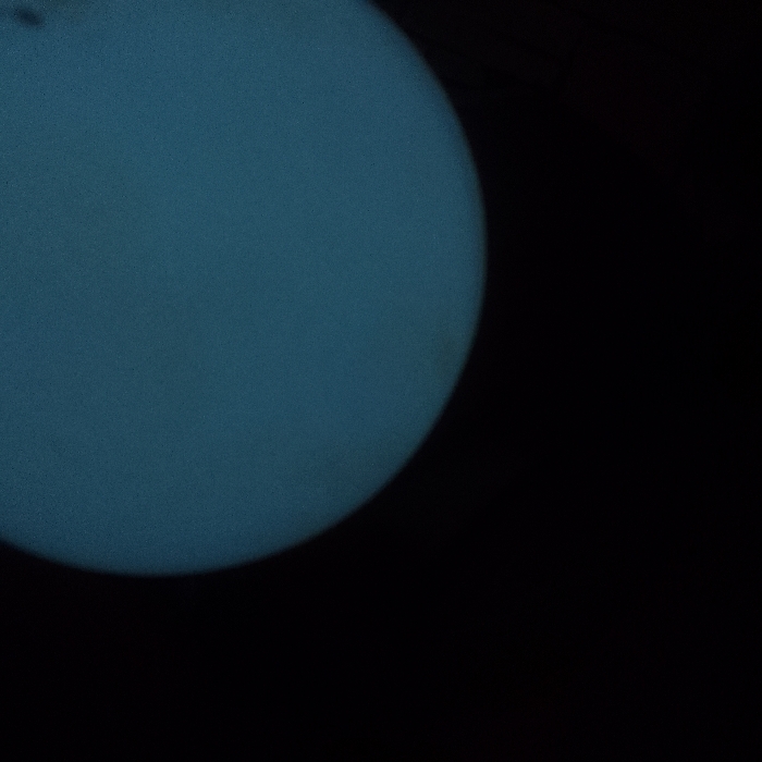 A blurred, round, bluish-gray object occupies the left portion of the frame against a dark, indistinct background. The object appears illuminated but out of focus, lacking sharp details. The background is primarily black, offering little to no discernible features. The overall image has a soft, ethereal quality.