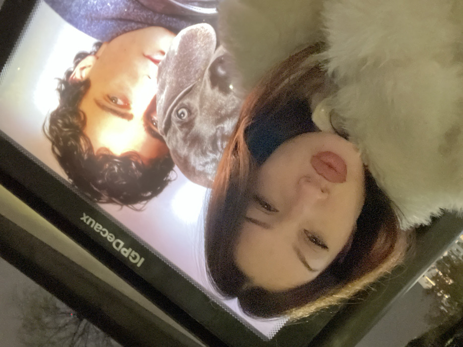 A young woman wearing a white, fluffy coat stands beside a billboard advertising a film. The billboard features a young man with dark, curly hair next to a large dog, potentially a Great Dane, with a close-up of its eye. The woman has dark hair and full lips, which are slightly pursed. The brand 'JCDecaux' is visible on the billboard's frame. The image is taken at a slight angle, with glimpses of trees and the evening sky in the background.