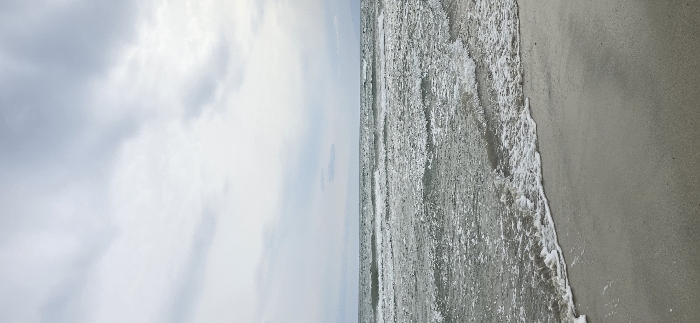 The image displays an outdoor coastal scene under an overcast sky in Unknown, Greece. The foreground consists of wet, light grey sand from a beach, where a line of white foamy waves is actively breaking and receding. The midground features a body of dark grey-green ocean water with numerous waves forming white caps. A discernible horizon separates the water from the sky, with a faint, distant landmass or mountain range visible along the right side of the horizon. The background is composed of a sky completely covered by light grey and white clouds. No individuals, animals, or artificial structures are present within the scene.