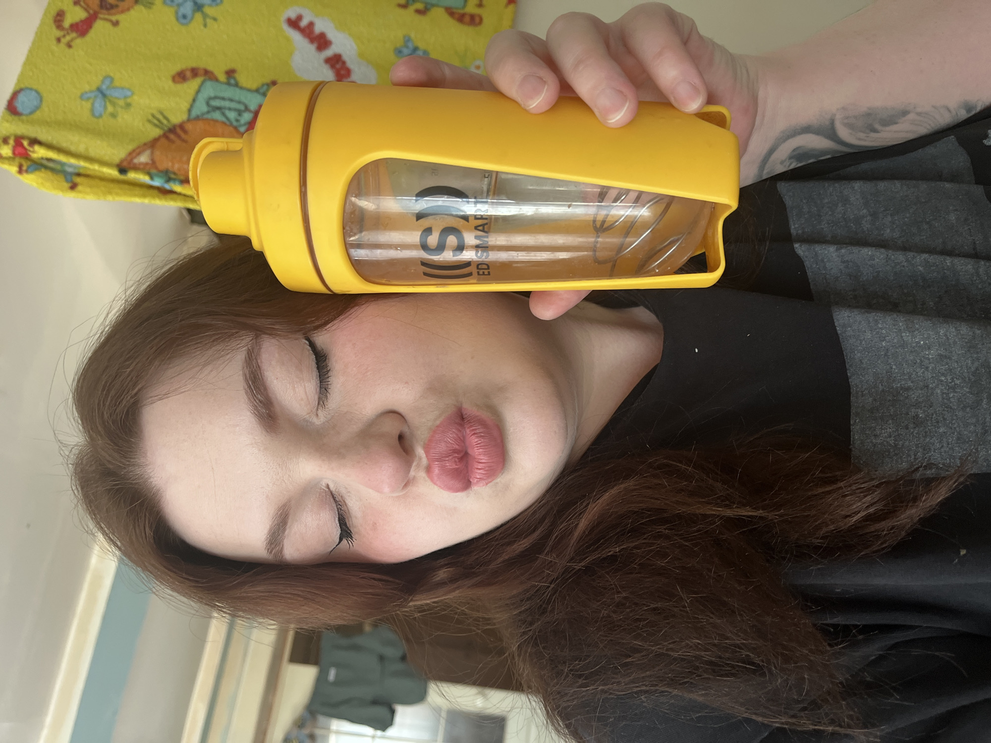 A female individual is depicted in a close-up, chest-up shot. Her eyes are closed, with winged black eyeliner visible. Her cheeks display a rosy blush, and her lips are puckered into a prominent pink "kiss" shape. She has long, reddish-brown hair cascading around her face and shoulders. With her left hand, she holds a yellow shaker bottle featuring a transparent central section that reveals a coiled wire whisk ball and partial text "((S)) ED SMART." A grey, swirling tattoo is visible on her inner left forearm. She wears a black and grey striped or color-blocked top. The background is partially out of focus, showing a yellow blanket with cartoon animal patterns (cats, butterflies) on the right, and a dark green garment hanging in the upper left, against a light-colored wall or ceiling. The specific location within the city of Павловка, Russia, cannot be determined from the visual information provided.