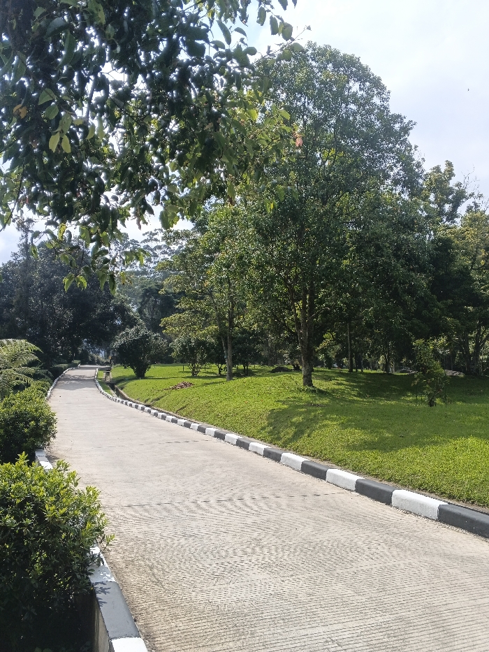 The image displays an outdoor, landscaped scene located in Bagochen Boolingpang Ueling, Bhutan. A light-gray, textured paved pathway originates from the lower center-right, curving gently uphill towards the left and receding into the background. The pathway is clearly delineated by continuous curbs painted with alternating black and white segments on both sides. To the right of the path, a well-maintained, bright green grassy slope ascends slightly, populated by multiple trees with full green canopies, which cast distinct shadows onto the grass. To the left of the path, dense green foliage, including shrubs and taller trees, lines the curve, with more distant trees and hazy terrain visible further back. The upper portion of the image reveals a light blue sky with some cloud cover, partially obscured by the dark green leaves of a tree in the immediate foreground. No people, animals, or specific actions are depicted within the scene.