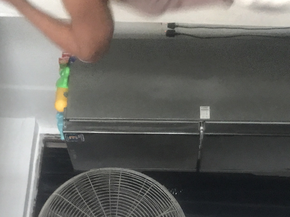 The image depicts an indoor scene in the city of Akure, Nigeria. A silver-toned, two-door refrigerator stands centrally in the frame. On its top surface are several colorful objects, including a blue, a yellow, and a green item resembling water guns, along with other small, indistinct items. A white label is affixed to the lower door of the refrigerator. To the left, the circular, metallic grille of a fan is partially visible, positioned in front of a dark opening or doorway. On the far right, a light-skinned right arm, bent at the elbow and partially covered by a light-colored sleeve, is visible. Adjacent to the right side of the refrigerator, two black power adapters with cords are plugged into white wall outlets. The surrounding walls are light-colored.