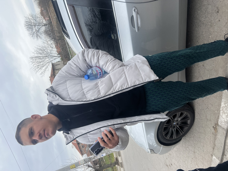 The image captures a male individual standing on a street in Dobrich, Bulgaria, under an overcast sky. The subject, a young adult with a short, closely-cropped haircut, is facing slightly left from the viewer's perspective. He is dressed in a light grey puffer jacket, unzipped, over a black quarter-zip long-sleeved top, and dark green patterned sweatpants with a white stripe along the outer seam of the right leg. He holds a dark-colored smartphone with a transparent case in his left hand, and a blue plastic water bottle labeled "DEVIN" is tucked under his right arm. To the subject's right, a silver sedan is partially visible, with a BMW logo identifiable on the front wheel. The ground consists of a concrete sidewalk leading to an asphalt road. The background features bare deciduous trees and several residential buildings with light-colored walls and red-tiled roofs.