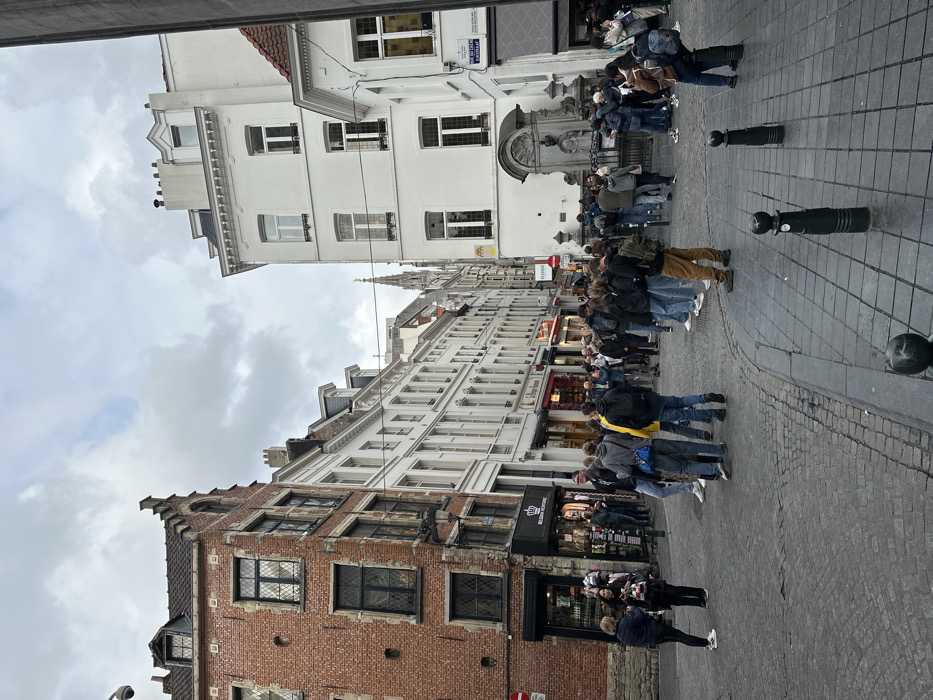 - "The image depicts a crowded street scene in Brussels, Belgium, at the intersection featuring the Manneken Pis fountain, located on Rue du Chêne (Eikstraat) as indicated by a street sign above the fountain" by FM-n6yWE2, licensed under CC BY 4.0