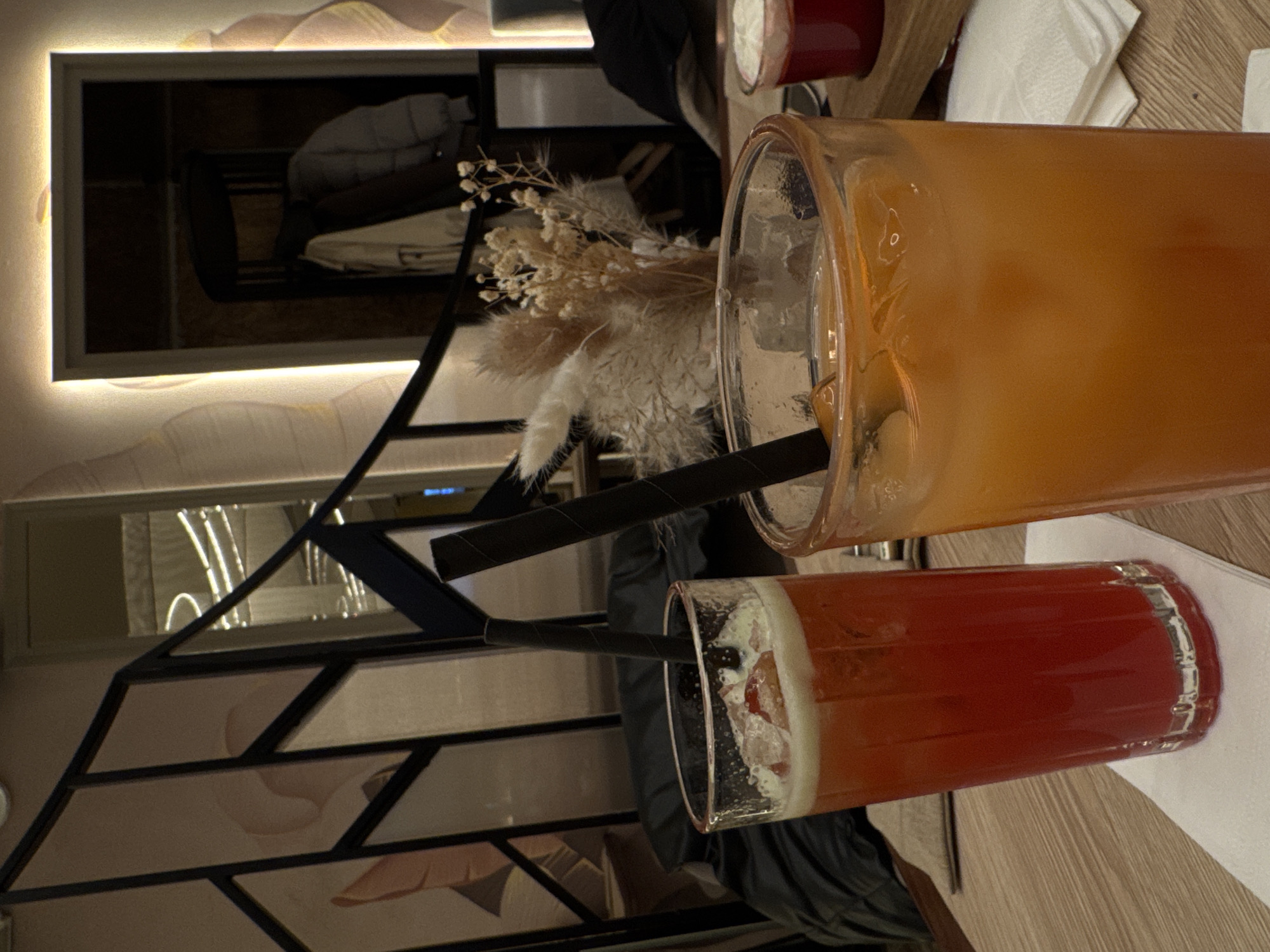 The image depicts an indoor scene within what appears to be a modern cafe or restaurant located in Saint Petersburg, Russia. In the foreground, two tall glasses with dark straws are positioned on a light-colored wooden table. The glass on the left contains a red beverage with ice and a layer of white foam, resting on a folded white paper napkin. The glass on the right, partially visible, contains an orange beverage with ice, also resting on a white paper napkin. A smaller, red glass with a white topping is visible behind the orange drink, placed on a small wooden coaster. The midground features a decorative black metal geometric room divider with light-colored panels behind it. A dried floral arrangement, including pampas grass and small white flowers, is situated between the drinks and the background elements. A dark jacket or bag is draped over an unseen object to the left. The background reveals contemporary interior design. To the left, subtle abstract wavy patterns adorn a wall, and bright, curved light fixtures are visible further back. To the right, a rectangular doorway or mirror frame is brightly illuminated with LED backlighting, revealing a dimly lit interior space beyond where a coat rack holds a light-colored puffer jacket and another white garment. No individuals are visible in the scene, and no direct actions are depicted. The overall lighting is warm and ambient. The specific establishment within Saint Petersburg, Russia, cannot be identified from the visual information provided.