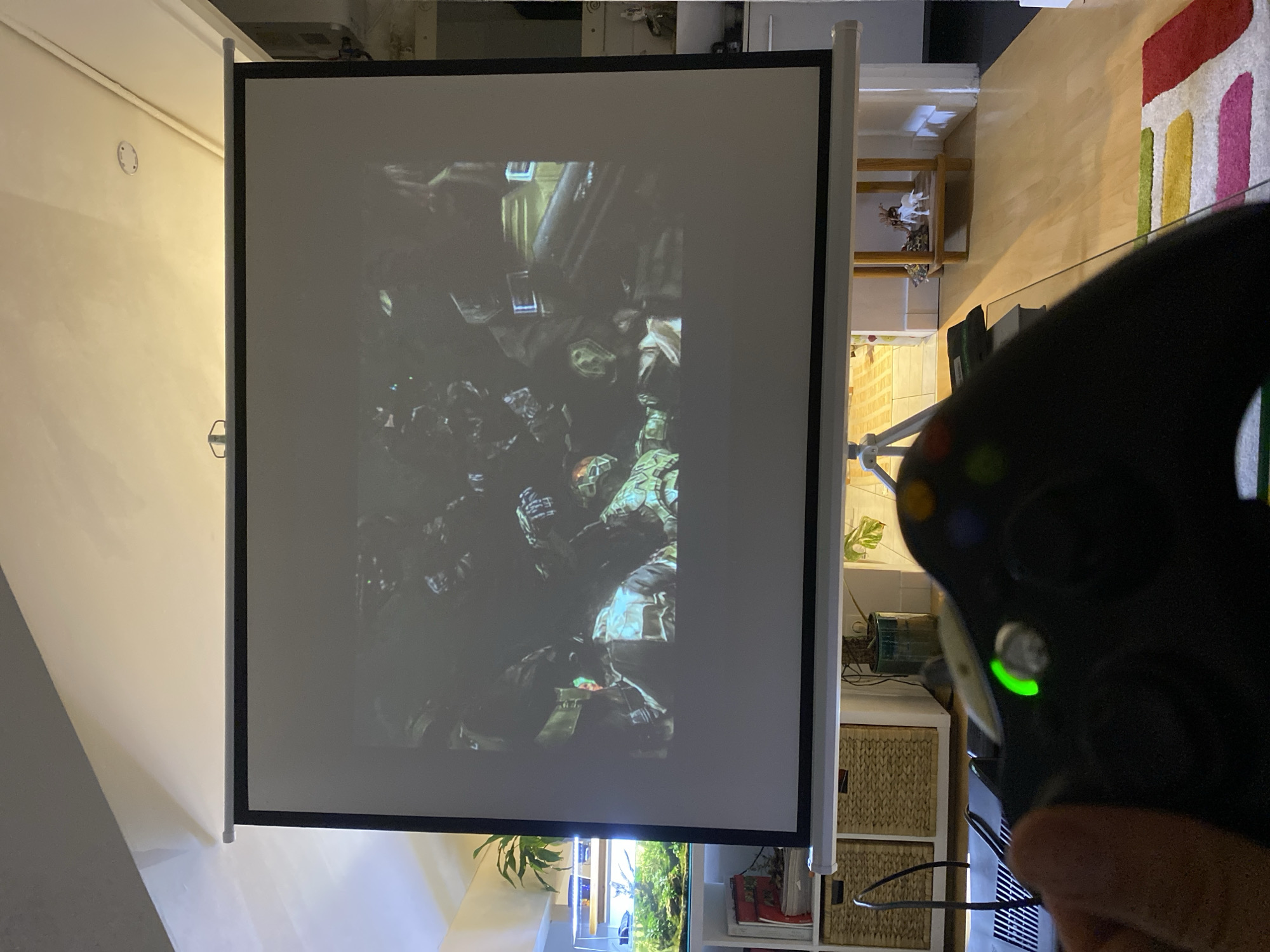 The scene depicts an interior residential space in Boulogne-Billancourt, France, focused on home entertainment in dim lighting conditions. In the immediate foreground, a person's right hand holds a black Xbox 360 controller; the controller's guide button emits a prominent green glow, indicating it is active. A black cable extends from the controller area towards the bottom left. Dominating the central midground is a large, white pull-down projector screen with a black border, displaying a dark, complex scene. The screen content appears to be from a video game or film, showing multiple figures in tactical or military-style gear, some with helmets and what look like goggles, positioned amidst a dimly lit environment with muted greens, browns, and grays. The screen is supported by a visible light-colored tripod stand at its base. The background reveals elements of a furnished room. To the left of the projector screen, a white shelving unit holds a large, brightly lit planted aquarium on its top shelf, containing aquatic plants and a dark-colored fish. Below the aquarium, two woven wicker baskets are visible within the shelving unit, along with books and other items. A large green potted plant is situated behind the aquarium. To the right of the screen, a light wooden side table with two tiers displays a white animal figurine, possibly a unicorn or horse, and a small potted plant. Beyond this, a white doorframe is partially visible. The room features light wooden flooring, with a small rectangular rug in the bottom right corner displaying horizontal stripes in red, pink, yellow, and green. The ceiling is white, and warm ambient lighting illuminates the space.