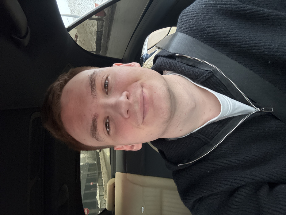 A man in a car is wearing a black zip-up jacket over a white t-shirt and a seatbelt. He's looking at the camera with a slight smile. The car interior is visible, featuring a beige leather seat with an embossed logo. Outside the window, a blurred, urban scene can be seen. The picture is taken at an angle.