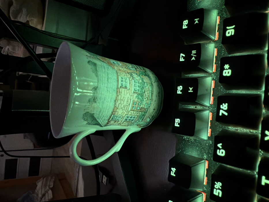 - "A ceramic mug featuring an illustrative depiction of a house or cottage is positioned centrally on a dark surface, partially obscuring a mechanical keyboard in the foreground" by FM-PJSDy1, licensed under CC BY 4.0