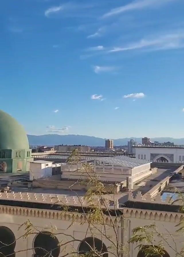 The video pans slowly across the rooftops of a building complex, culminating in a shot of the sun shining against a clear blue sky. The camera starts focused on the green dome of a mosque or similar building, complete with a crescent moon topper. The complex features cream-colored walls with repeating arch patterns. Beyond the buildings, a cityscape can be seen with mountains on the horizon. As the camera pans right, the sun comes into view, bright and partially obscured by atmospheric haze. There are a few wispy clouds in the otherwise clear sky. A bare tree branch is visible in the foreground throughout.