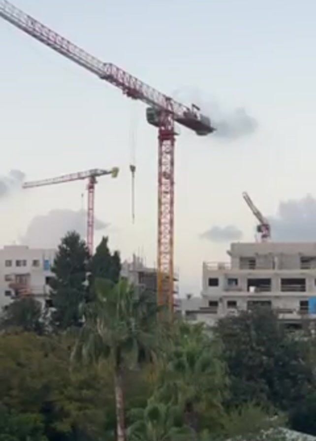 landscape with multiple construction cranes against a cloudy sky. There are three large cranes visible in the frame, towering over partially constructed buildings and trees, including palm trees. The buildings appear to be multi-story residential structures. In the lower part of the video, there are trees with green foliage and a low, possibly white roof. The lighting suggests it's either early morning or late afternoon, given the diffuse light. A distinct sound resembling a cat meowing can be heard.