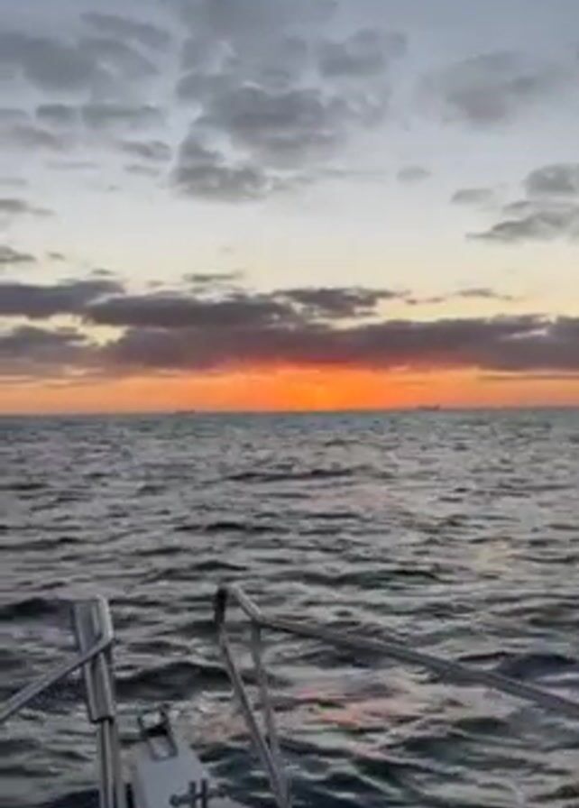 boat sailing on the ocean at sunset. The sky is cloudy with shades of gray and orange. The sun is setting on the horizon, creating a bright orange glow. The water is dark and choppy, with small waves. The boat has a white hull and a silver railing. There are no people visible in the video.