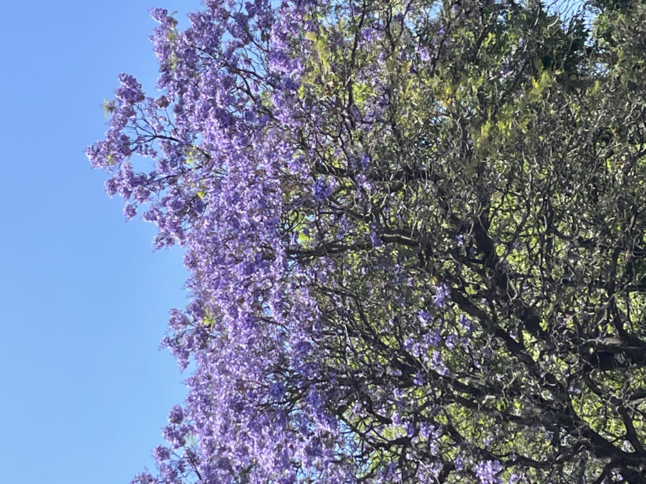 The scene depicts a large tree in full bloom under a clear, bright blue sky in the city of Unknown, Unknown