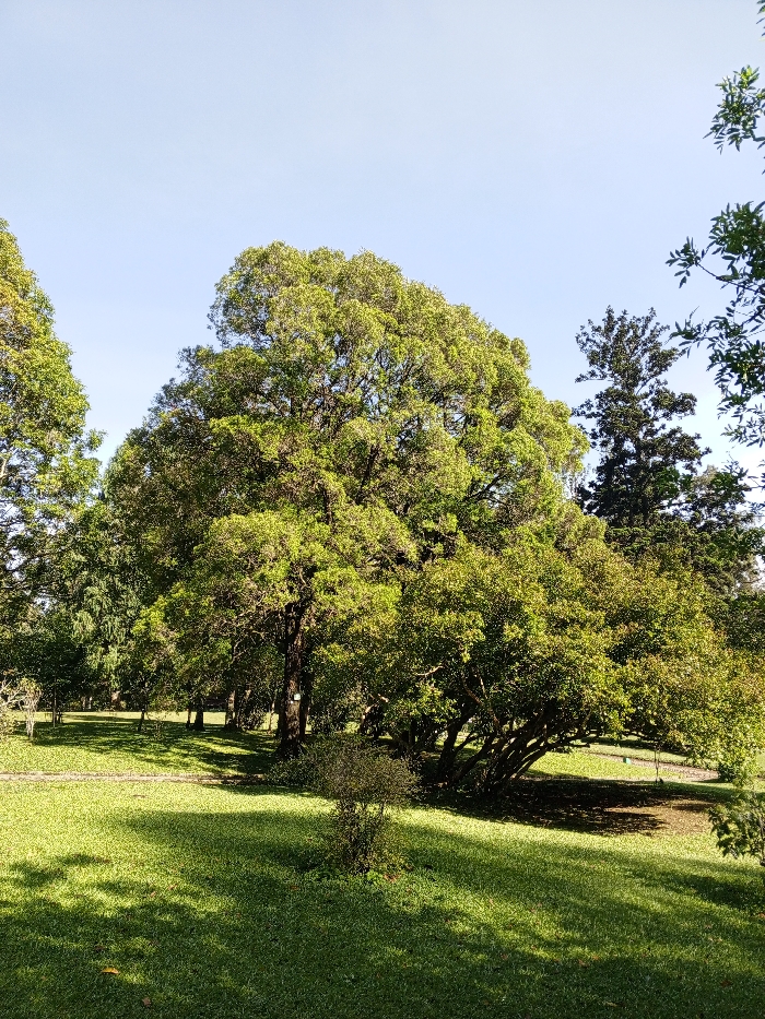 A large tree dominates the center of the frame, casting shadows across a vibrant green lawn. Other trees and foliage surround it, creating a lush, park-like setting. The sky is a clear, pale blue. Sunlight filters through the trees, illuminating patches of grass.