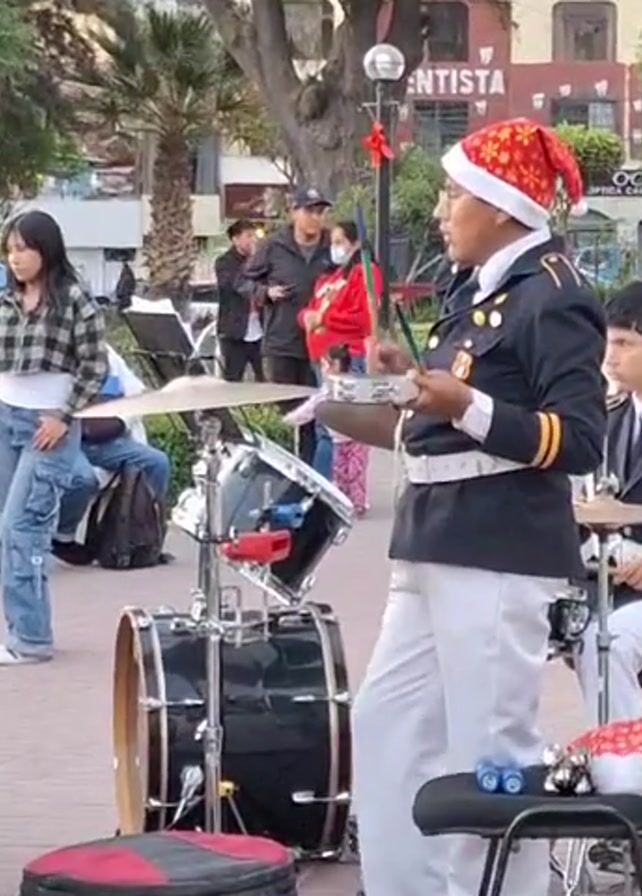 A public park scene shows a marching band giving an outdoor performance. The main subject, a young man in a black and white marching band uniform, stands behind a drum set and is holding a tambourine. He’s also wearing a festive red and white Christmas-themed Santa hat. The band is surrounded by people, some watching, others recording with their phones. The setting is a plaza, evidenced by trees, benches, and surrounding buildings, one of which has the word “ENTISTA” visible. The mood appears festive, given the holiday-themed accessories and the performance occurring in a public setting.