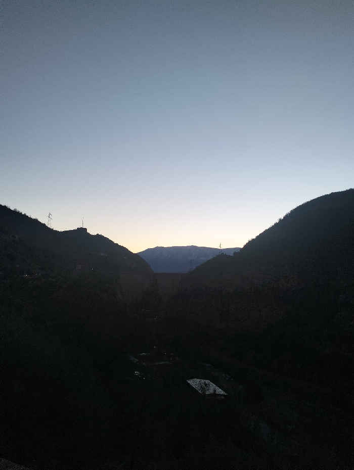 A silhouetted valley landscape stretches between two dark hills, capped by a fading blue sky. A low, yellowish band marks the horizon. In the distance, snow-capped mountains are barely visible. Closer, a dam structure stands as a stark, dark shape. Further down in the valley are a few houses or structures nestled amongst the dark terrain. Overall, the image is dark, but hints of light suggest a sunrise or sunset.