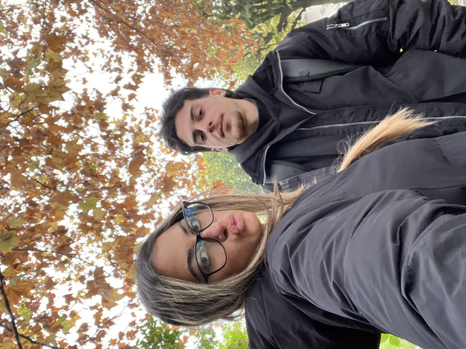 The image presents two individuals, a female and a male, in a close-up outdoor portrait, presumably in Erstein, France. The female, positioned on the left in the foreground, has long, light-colored hair, wears black-rimmed glasses, and a black puffer jacket. A silver stud is visible in her right nostril, and her lips are pursed forward. The male, positioned behind her to the right, has dark hair and light facial stubble, dressed in a black hooded sweatshirt beneath a black bomber-style jacket. A black backpack strap is visible over his right shoulder. Both individuals are looking directly at the camera. The background consists of tree canopies displaying autumn foliage, predominantly brown and orange leaves, with some green foliage also present, under an overcast sky.