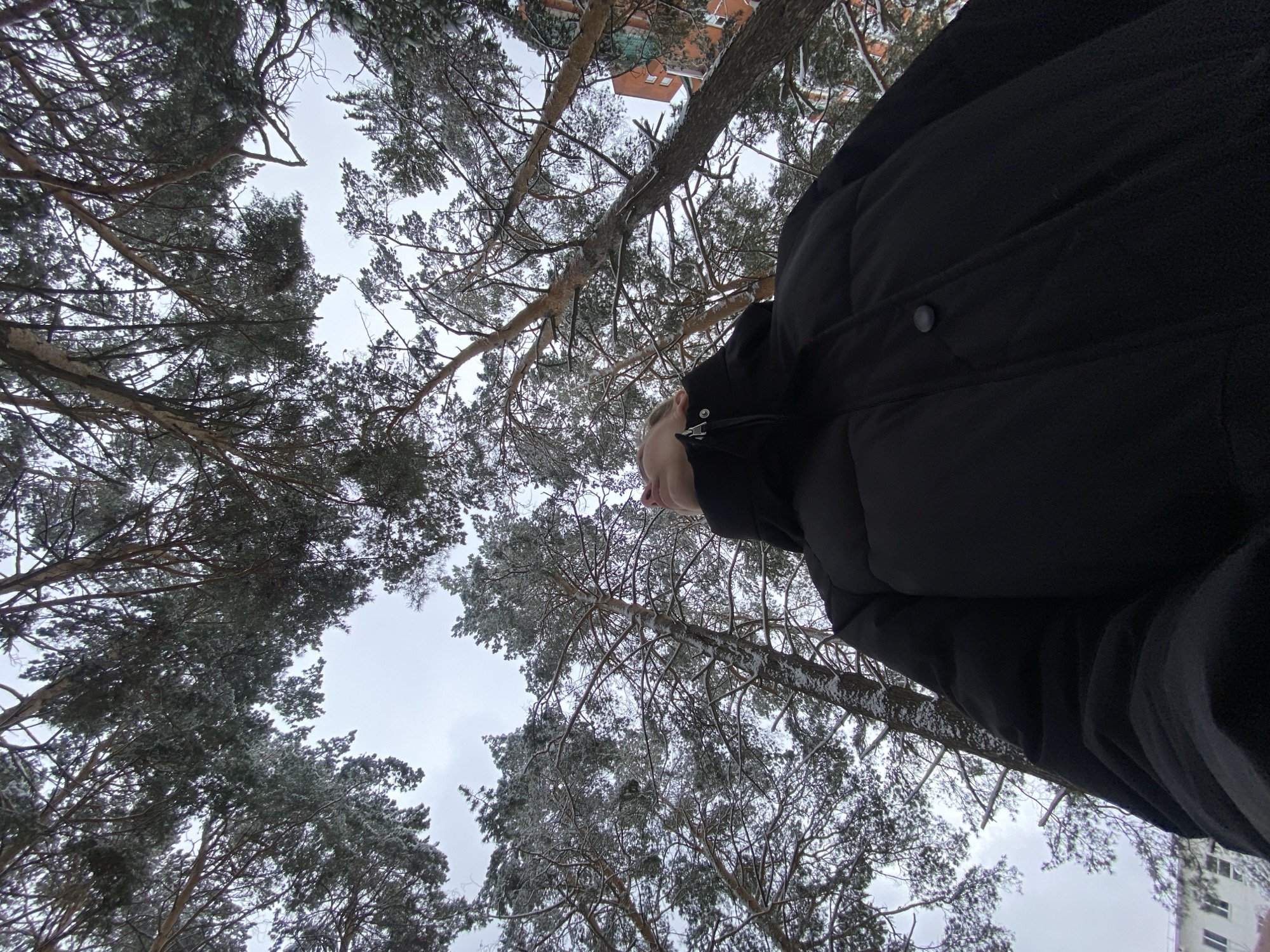 The image presents a low-angle view in Chaikovsky, Russia, looking upwards through a snow-covered pine forest on an overcast day. The sky is visible through the branches. The individual holding the camera is wearing a black winter jacket. A few apartment buildings are visible in the background.
