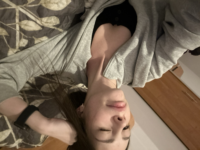 - "A woman wearing a gray zip-up hoodie over a black top is lying on a patterned blanket" by FM-5yziL2, licensed under CC BY 4.0