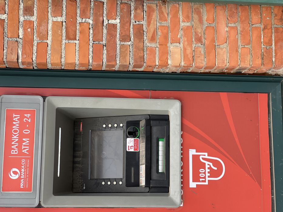 An outdoor close-up depicts an automated teller machine (ATM) unit on a building facade in Boreti, Montenegro