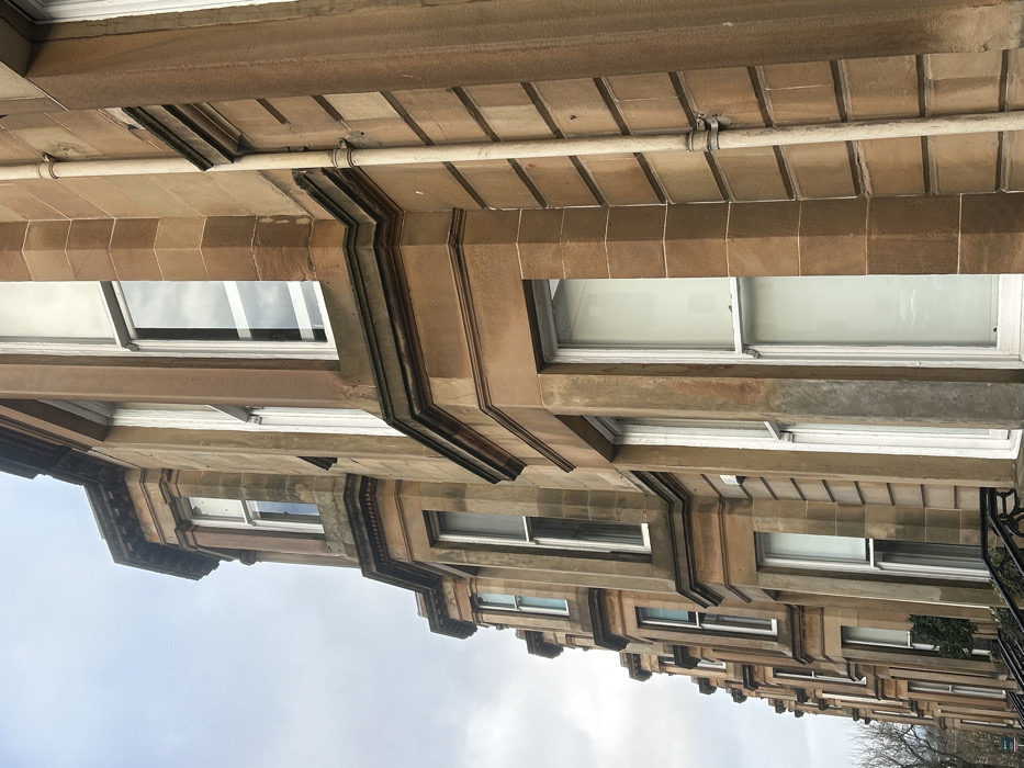 A low-angle shot presents the facade of a multi-story sandstone building. Regular window patterns are observed, each framed by protruding architectural details. A horizontal pipe runs above the windows, affixed to the stone. The perspective emphasizes the building's height against a cloudy sky. The repetitive architectural motifs suggest a classical or historical design, possibly a residential or commercial structure.