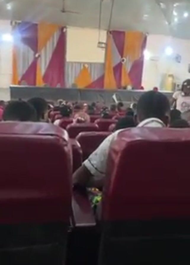 view from the back of a theater-style auditorium filled with people sitting in red cushioned seats. A person wearing a white t-shirt and a black hat is walking through the rows. The room is large with a high ceiling, lit by fluorescent lights and ceiling fans. The stage at the front is decorated with colorful curtains of yellow, orange, and burgundy. Some people are looking toward the stage, while others are turned toward the person walking through the rows.