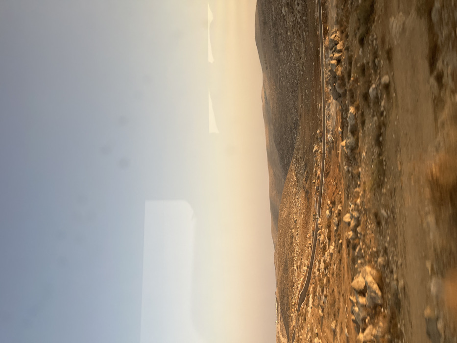 This wide-angle image depicts a barren, rocky, and hilly landscape near Carmel, Palestinian Territory, observed during what appears to be sunset or sunrise due to the warm, golden light illuminating the scene. The sky transitions from a pale blue at the top to a soft orange-yellow near the horizon. The photograph exhibits reflections in its upper half and slight motion blur in the immediate foreground, suggesting it was captured through a vehicle window. The foreground and midground are characterized by dry, reddish-brown soil densely scattered with numerous light-colored boulders and sparse, low-lying, dry vegetation. A dark, paved road, likely asphalt, winds horizontally through the midground, extending from the lower left towards the right and disappearing behind a rise. Along this road, approximately in the center-left, two small, dark, indistinct figures are visible, suggestive of individuals walking or standing. The background consists of successive layers of rolling, arid hills, appearing progressively lighter and hazier with distance. On the far left horizon, faint structures, possibly buildings of a distant settlement, are discernible. No active interactions are apparent.