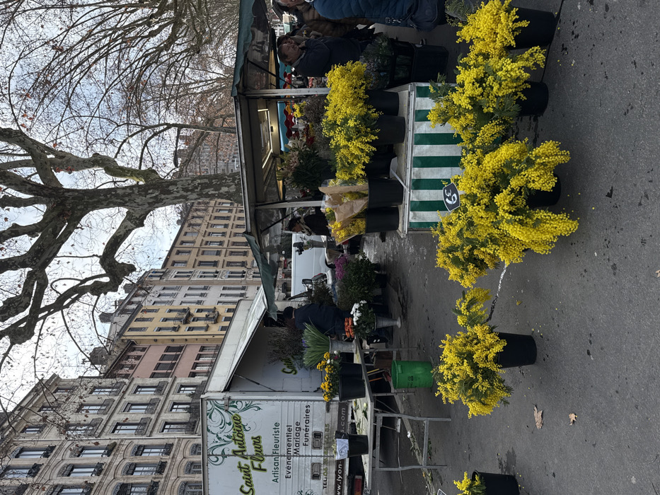 This image depicts an outdoor flower market situated at the Quai Saint-Antoine in Lyon, France. In the foreground, numerous black buckets hold vibrant yellow mimosa flowers, arranged on the paved ground and atop a green-and-white striped display stand, with some items priced at "6€". To the left, a white delivery truck emblazoned with "Saint Antoine Fleurs" and "lyon.fr" functions as a vendor stall, displaying various cut flowers in buckets on an adjacent metal folding table. Multiple individuals are present: one person in a dark jacket is positioned near the back of the white truck, seemingly attending to flowers. Further right, several customers or vendors are observed near additional market stalls, which feature green awnings and display a diverse selection of flowers, including bundled bouquets wrapped in brown paper. The background reveals a row of multi-story residential or commercial buildings, exhibiting varied pastel facades typical of European architecture, under an overcast sky. Large, leafless deciduous trees with mottled bark are prominent, rising above the market stalls.