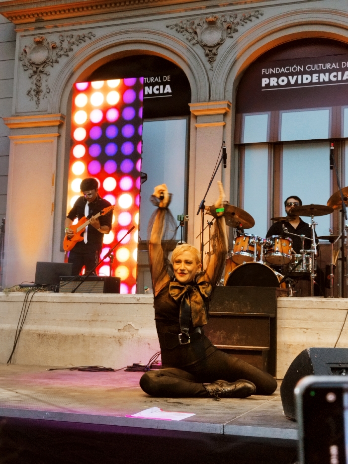 The image captures a live musical performance on an outdoor stage in front of the Fundación Cultural de Providencia building in Providencia, Chile