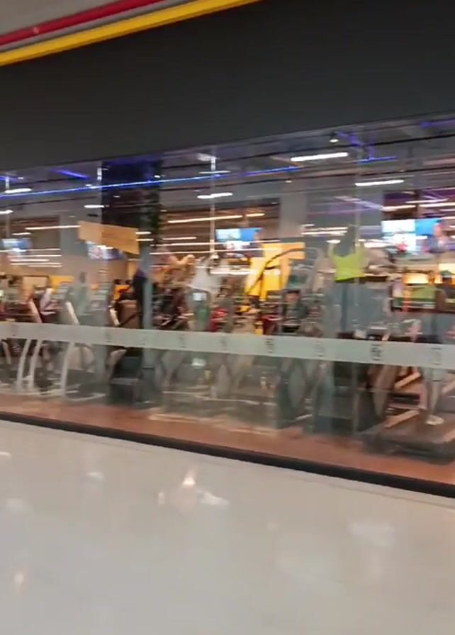 gym behind a large glass wall. People are using treadmills, and there is other workout equipment visible in the background. The floor in front of the glass is white and reflective. The ceiling is white with some exposed piping in red and yellow. The scene is well-lit and appears to be inside a commercial or retail space.