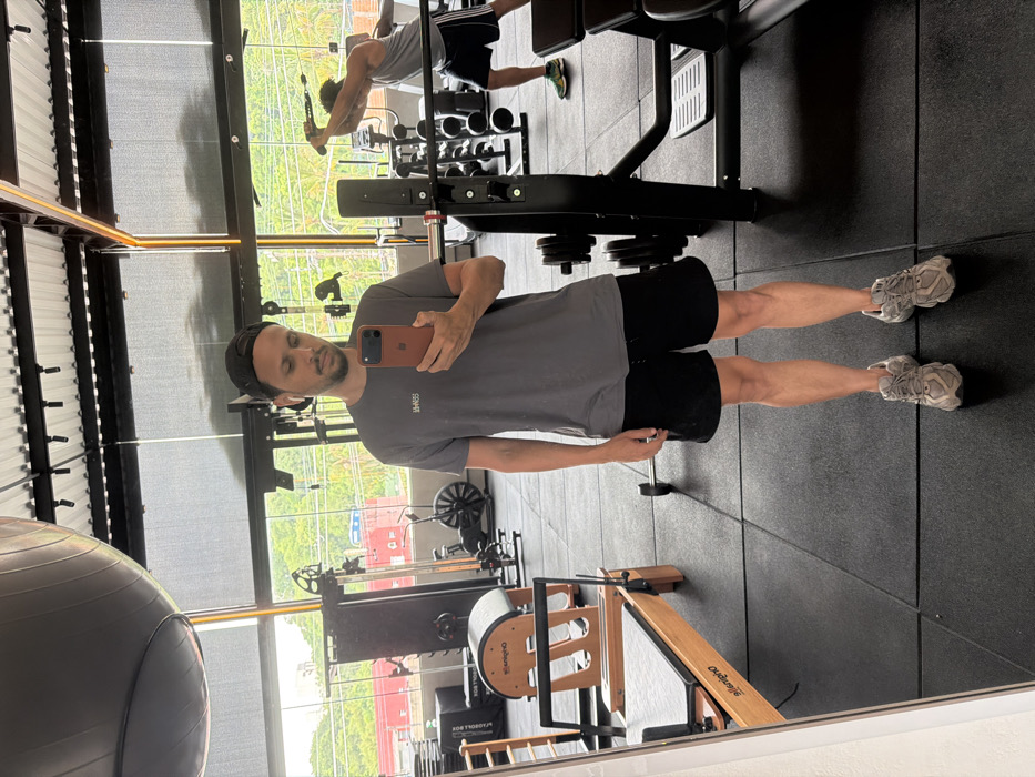 A man stands in a gym, taking a selfie in a mirror. He wears a gray t-shirt, black shorts, and sneakers, with a black baseball cap. Exercise equipment surrounds him, including a cable machine, rowing machine, and exercise ball. Another person works out in the background. The gym has large windows and dark flooring.