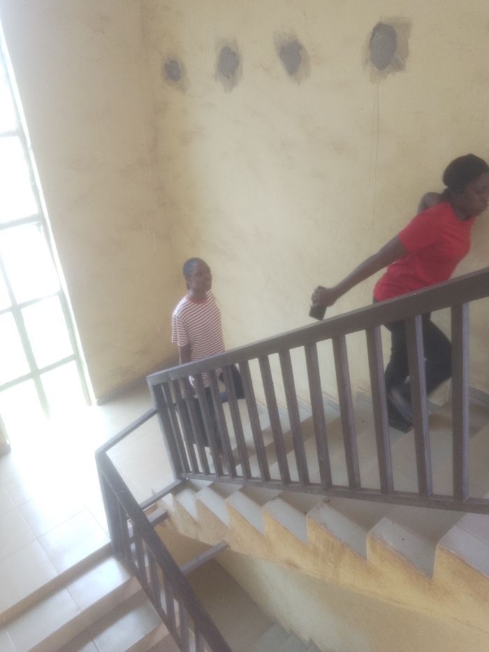 The image depicts an interior stairwell within a building in Onitsha, Nigeria