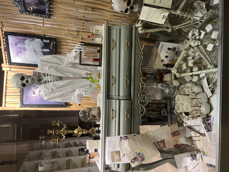 This is a retail storefront display located in Fuengirola, Spain. The elaborate, Halloween-themed arrangement features two full skeletal mannequins and numerous objects, primarily perfume bottles, within a lighted window. A standing skeletal mannequin, clad in a white lab coat, occupies the upper section of the display, positioned behind an ornate, light gray dresser with a white marble surface. On the dresser top, from left to right, are a brass five-arm candelabra, a white pillar candle, various dark and clear small perfume bottles, a glass cloche enclosing a small object, a green antique-style bottle, a crystal perfume atomizer, clear beakers containing light liquids, and a wooden holder with two test tubes filled with dark red liquid. Additional perfume bottles are interspersed on the dresser. The background behind this skeleton consists of a bamboo screen adorned with three framed, dark-themed prints: one of a monstrous figure, one of two pale children, and one of a male in historical dress. Reflections in the display glass to the left show interior store shelving filled with numerous small bottles. On the lower display level, a seated skeletal mannequin holds open a book titled "THE ART OF SCENT." This figure is surrounded by a dense collection of small, clear perfume bottles, scattered skeletal bone props (limbs and skull parts), and promotional papers. A tombstone prop inscribed "REST IN PIECES" is situated behind this figure. Three white pillar candles are placed within a wreath-like object composed of bone fragments. Branding for "CULT PERFUMES" is visible on several boxes and literature within this lower section.