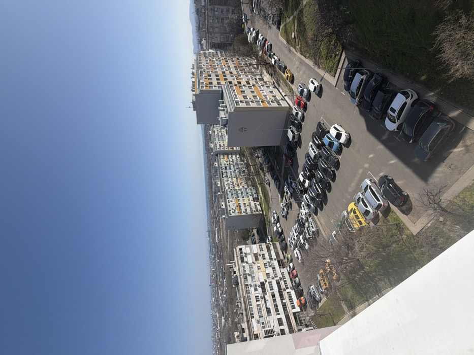 The image displays a high-angle, wide-view perspective of a residential area in Burgas, Bulgaria, likely situated within a large housing complex such as zh.k. Slaveykov or zh.k. Izgrev. The sky is clear, bright blue, and cloudless, encompassing the upper half of the frame. The horizon reveals a distant city skyline, a segment of the Black Sea, and faint mountains to the far right. The scene is dominated by numerous multi-story residential buildings constructed of grey concrete. A prominent block in the mid-right features a grey facade with distinct horizontal bands of orange and yellow, and the numeral "17" is clearly visible near its upper section. Another large, grey apartment building with multiple windows and visible external air conditioning units occupies the mid-left. Several other similar residential structures are dispersed throughout the urban landscape in the background. The foreground and midground are primarily composed of asphalt parking lots and connecting roads, densely populated with dozens of parked passenger vehicles. These vehicles, including sedans, hatchbacks, and SUVs, exhibit a range of colors, predominantly dark tones like black, grey, and silver, but also feature white, yellow, and red automobiles. They are parked in various configurations, both in designated bays and along roadways. Sparse, leafless deciduous trees are distributed across green patches of grass between the buildings and parking areas, suggesting a late winter or early spring season. Bright sunlight illuminates the entire scene, casting distinct shadows from the buildings and vehicles towards the bottom-right of the image. No individuals or active interactions are observed. The viewpoint originates from an elevated position, likely an upper floor of a building, with a portion of a white structure visible in the lower-left foreground.