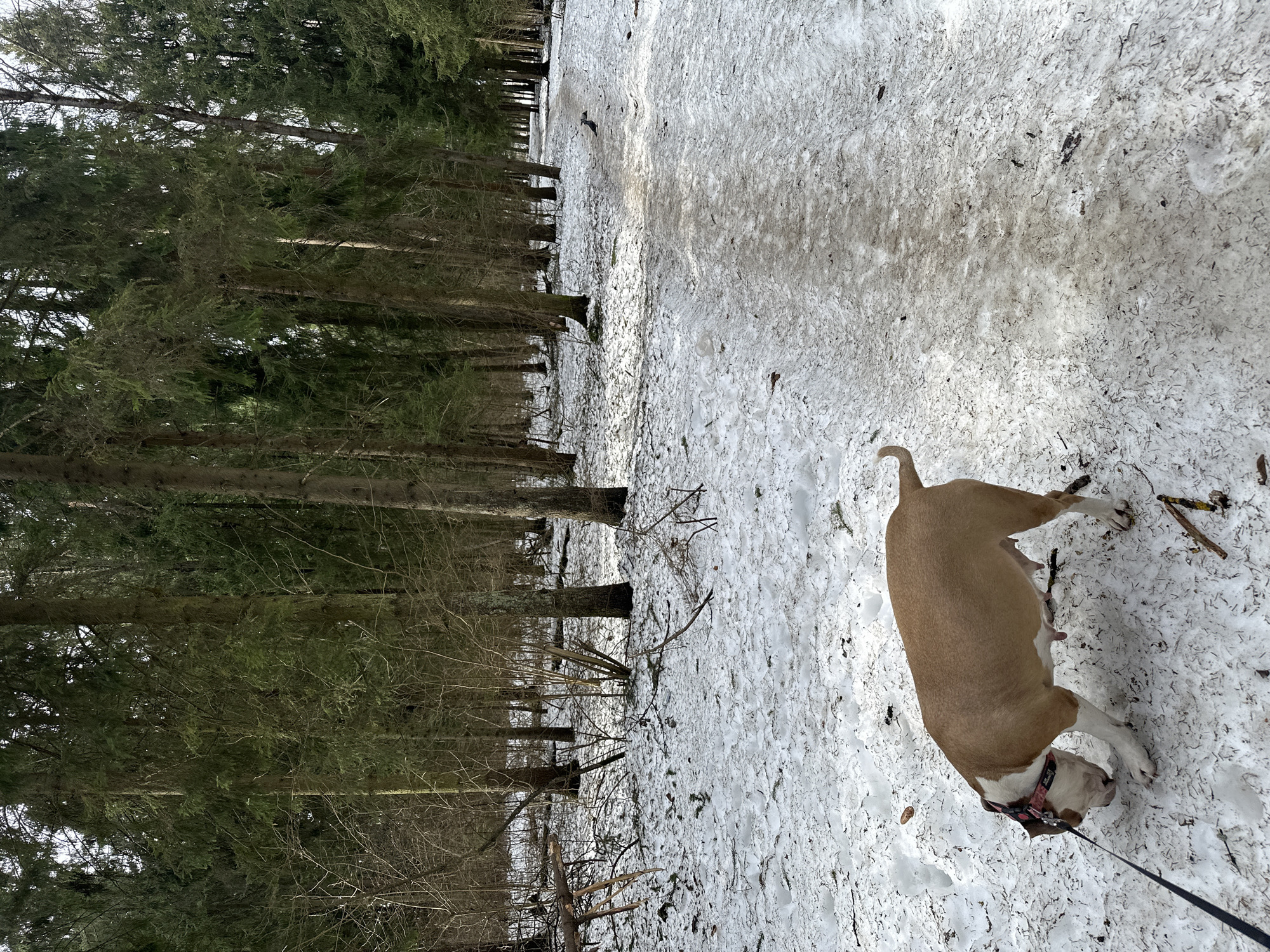 The image presents an outdoor scene in a forest located in Trudovaya, Russia, during a transitional season with snow cover. In the foreground, a tan and white short-haired dog, consistent with an American Bully type, is depicted with its head lowered, actively sniffing the snow-covered ground. The dog wears a red collar with a patterned design, and a black leash extends from its collar towards the lower-left, partially out of frame. The dog's abdomen appears distended. The ground is unevenly covered with patchy, melting snow, revealing underlying dirt, pine needles, and scattered small branches and twigs. A distinct path, partially cleared of snow and appearing slushy or icy in sections, extends from the immediate foreground into the depth of the forest, slightly curving to the right. The surrounding environment consists of a dense forest primarily composed of tall, dark green coniferous trees, likely spruce or fir, with some bare deciduous trees visible, particularly to the left. In the middle distance along the path, a dark-feathered bird, possibly a crow, is discernible. Natural daylight illuminates the scene, suggesting an overcast or partly cloudy sky. No human subjects are visible within the frame.