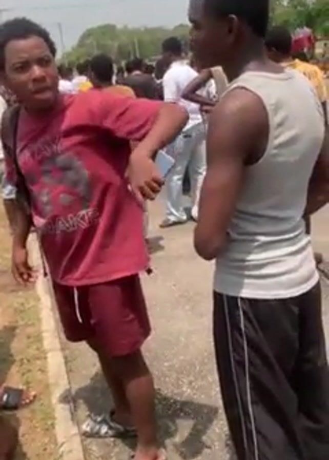 crowd of young men on a paved area near some grassy patches and a drainage ditch. One man wears a maroon t-shirt and shorts and speaks emphatically while gesturing. Another man in a gray tank top is looking at him. Several others are standing nearby, and the crowd extends into the background. A dark-colored car with its driver-side door open is parked halfway down the side of a short grassy bank into the drainage ditch. More of the crowd surrounds it. The overall impression is of a gathering, perhaps an incident has occurred with the car.