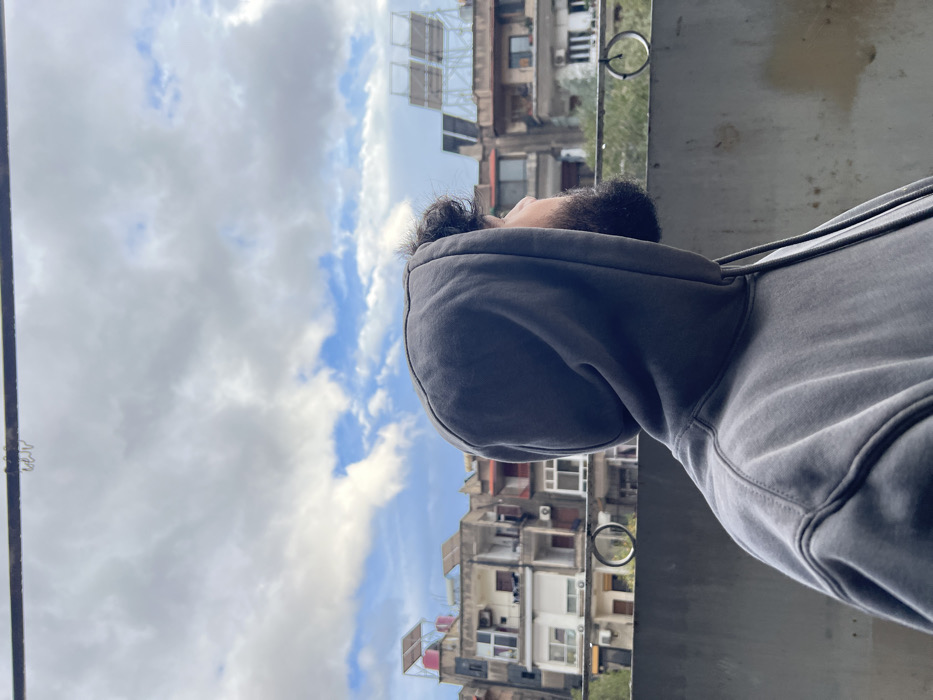 The image displays an urban scene within Joubar Municipality, Syria, captured from an elevated perspective, likely a balcony or terrace. In the right foreground, an individual is partially visible from the right side of their head and upper torso, wearing a dark grey hooded sweatshirt. Dark facial hair is discernible on the individual's right cheek and jawline. The person is oriented to look towards the right of the frame, observing the distant buildings and sky. Below the individual's line of sight, a dark grey horizontal barrier transitions to a black metal railing with two circular decorative elements. Above the individual and towards the top center of the frame, a thin dark horizontal rod or wire is visible, from which two small, light-colored clips are suspended. The midground is dominated by a densely packed residential area comprising multiple multi-story buildings. These structures appear to be constructed from concrete or stucco, exhibiting a weathered appearance. Various architectural features are visible, including multiple balconies (some enclosed), windows (some with white roll-down shutters), and numerous external air conditioning units mounted on building facades. On the roof of a building to the left, a red cylindrical water tank is present. Further to the right, on another rooftop, a large, rectangular metal framework, possibly supporting solar panels or utility equipment, is erected. The background consists of a partly cloudy sky, characterized by significant white and grey cloud formations interspersed with patches of clear blue sky. No direct interactions between individuals are depicted. The overall environment is that of a residential urban setting under natural daylight conditions.