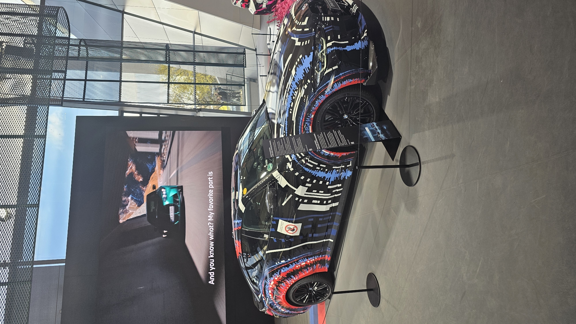 BMW car with a patterned camouflage wrap on display indoors. The car is black with red, white, and blue graphics. It is mounted on a stand with a small display adjacent to it. A screen to the left shows a video of a green car driving on a winding road. The screen also has text that reads, "And you know what? My favorite part is...". The background shows a window with a metal grid-like structure. The car is inside the BMW Welt, an exhibition center and museum located in Munich, Germany. The flooring is grey concrete.